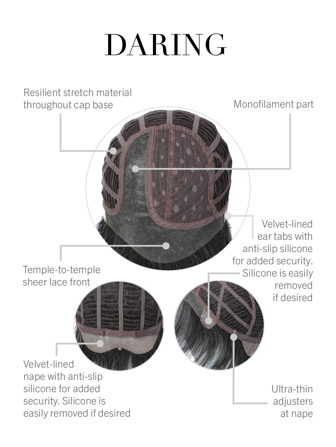 • Anti-slip silicone-lined ear tabs keep the wig anchored at the temples