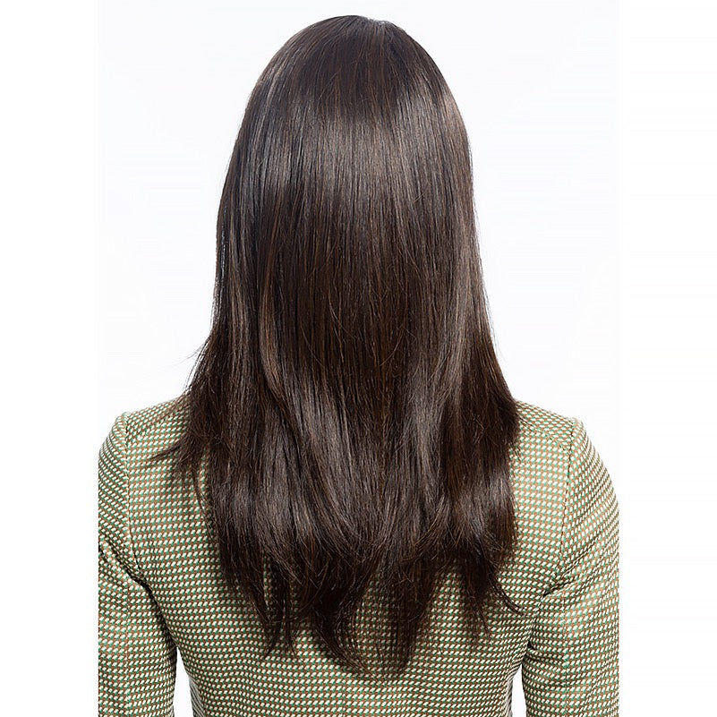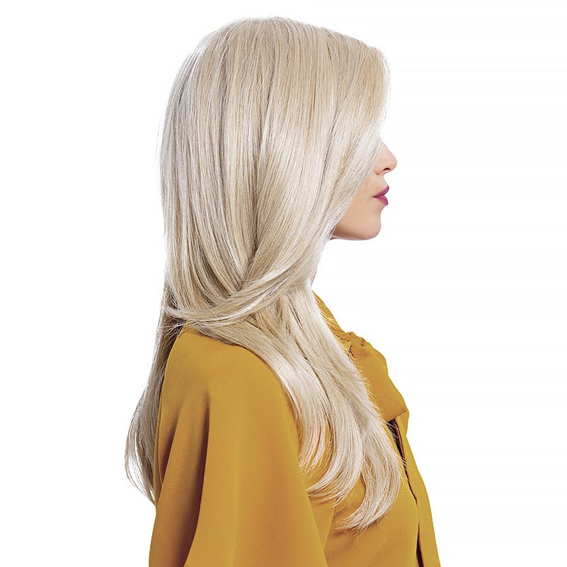 Sensational is a part-anywhere with face framing bangs that graduate into feathered layers that fall to the mid back. A Sheer Comfort cap with a hand knotted soft monofilament mesh and ear to ear lace front designed for an undetectable hair line. All day, every-day comfort and the styling versatility to brush back off the face and even pull your hair into a pony-tail.