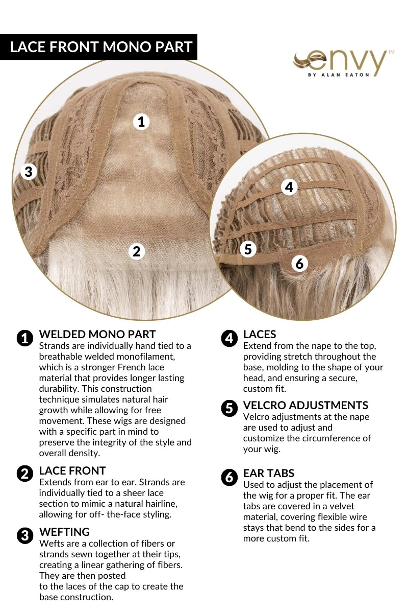 - Cap Design: Features Envy's SoSoft cap technology, integrating a lace front and monofilament part for a realistic hairline and parting.