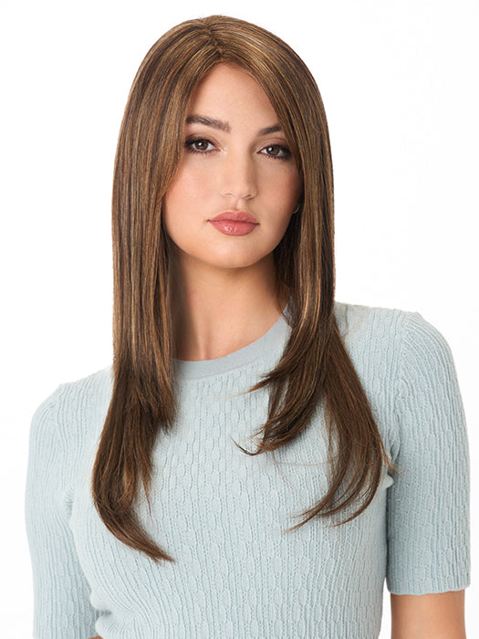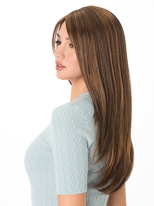 McKenzie is genuinely long — 17.75" at the sides, 15.75" at the nape, and 14.5" at the crown — with the slight graduation between crown and sides creating the professional layered effect of a style cut specifically to flatter. The long smooth layers throughout add movement and dimension to the straight texture without sacrificing the clean, sleek quality that long straight hair is known for. The 5.5" side-swept fringe at the front frames the face softly and blends naturally into the layers, adding a face-framing quality without creating a heavy or uniform fringe line. At 168g (5.9 oz), McKenzie honestly reflects its generous length — and the hand-tied construction distributes that weight naturally throughout the cap for all-day comfort.