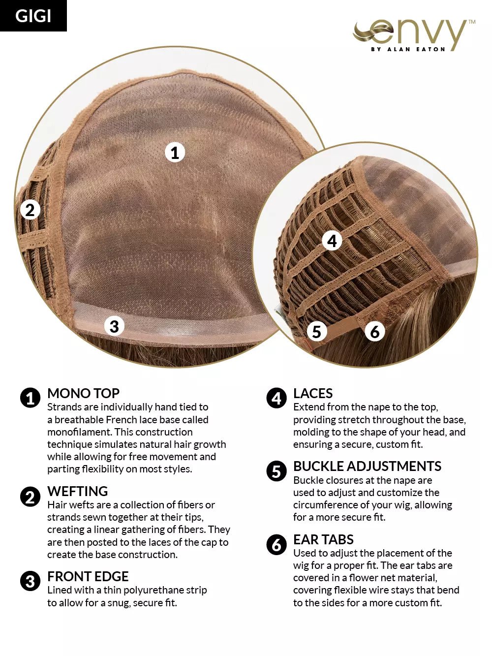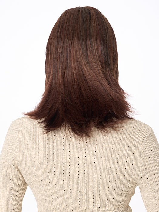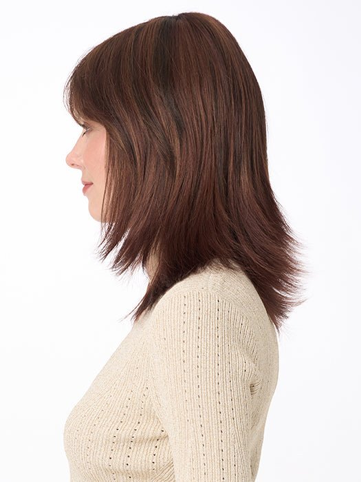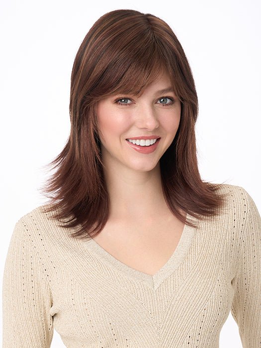 Girl next door meets modern fashion guru in this shoulder-length beauty by Envy. Featuring long, gentle layers, flared ends, and wispy, face-framing bangs, Gigi is sure to turn heads in neighborhood and nightclub, alike. The Mono Top construction allows you to wear this wig up or down, toward or away from your face, without revealing anything but impeccable style.