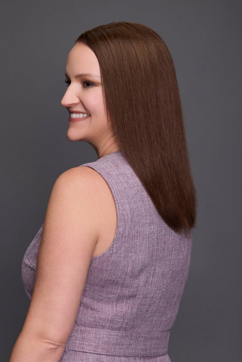 The easiPart XL Wide Human Hair 14" by Jon Renau is a wider-base human hair topper built for women in the beginning to beginning-mid stages of hair loss who need more coverage than a standard topper provides — but aren't ready to commit to a full hair system. With a generous base, 14 inches of 100% Remy human hair, and flexible attachment options that bridge the gap between clip-in convenience and bonded security, this topper is designed to grow with your needs rather than limit them.