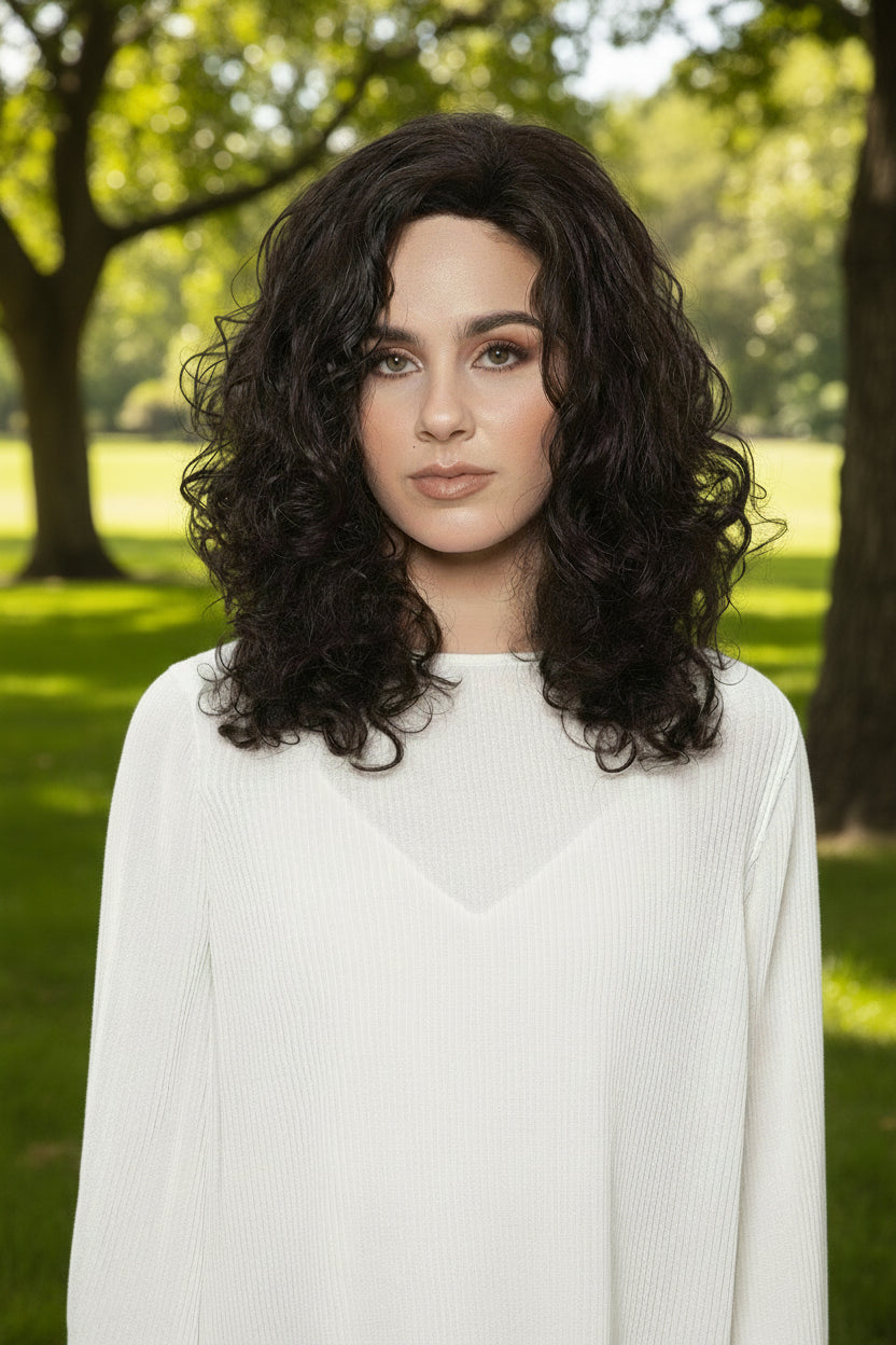 Massen von dichten, fließenden Locken, die über die Schultern fallen, sorgen für einen sehr femininen Look.