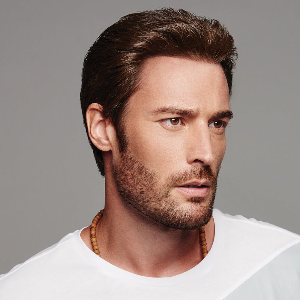 This cut has free-flowing, longer lengths on top with loosely textured sides and back. All over, piecey, razor cut lengths are long enough to tuck behind the ears for a sleek look. The lace front was made specifically for HIM and creates the ultimate hairline that can be styled forward or back. This style got its name for its casual look and tough attitude.