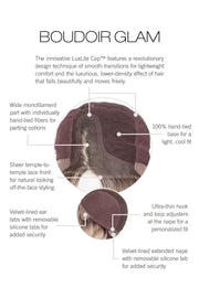 - Cap Construction: Temple-to-temple lace front (Sheer Indulgence™), monofilament part, hand-tied base, velvet-lined ear tabs, extended nape