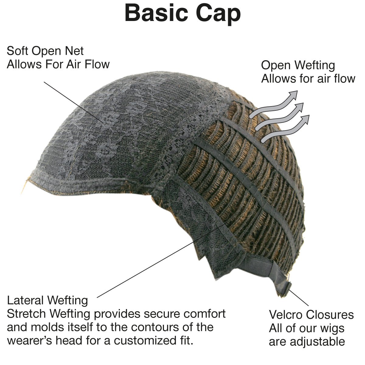 Mid-length layers of beachy waves, feathered bangs, a smooth silky top, and a bob back that falls below the collar. Featuring a Cool Comfort cap designed to mold itself and memorize the contours of your head for all-day, every-day comfort.