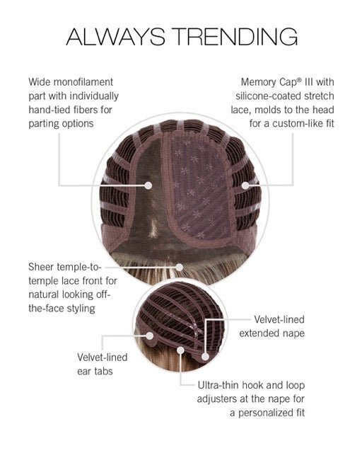 Always Trending représente la fusion parfaite entre la technologie de pointe des perruques et la sophistication d'un style intemporel. L'association des fibres TRU2LIFE thermo-compatibles et de la construction Memory Cap III garantit que vous recevrez une perruque non seulement magnifique, mais qui s'adaptera à votre style de vie et à vos préférences en matière de coiffure.