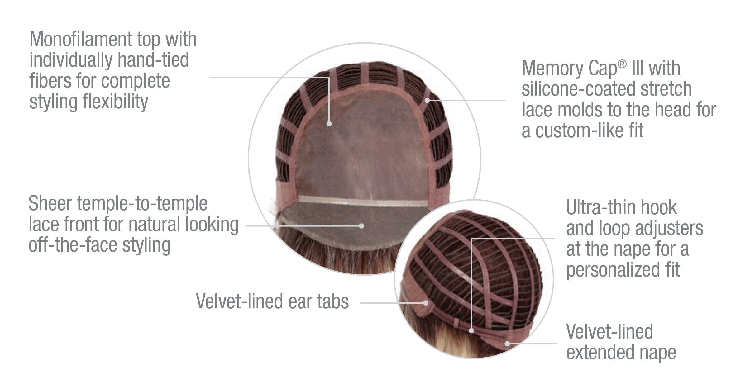 - Cap Construction: Temple-to-temple lace front (Sheer Indulgence™), monofilament top, Memory Cap® III base, velvet-lined ear tabs, extended nape