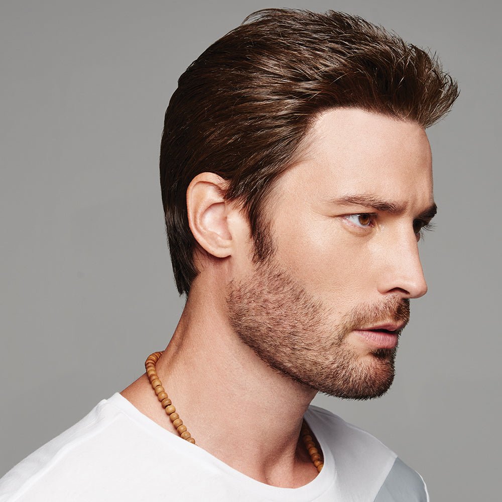 This cut has free-flowing, longer lengths on top with loosely textured sides and back. All over, piecey, razor cut lengths are long enough to tuck behind the ears for a sleek look. The lace front was made specifically for HIM and creates the ultimate hairline that can be styled forward or back. This style got its name for its casual look and tough attitude.