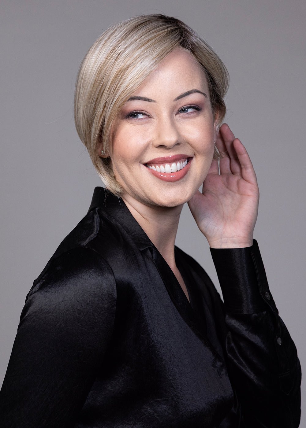 The front knotting technology provides versatile off-the-face styling, perfect for showcasing the expertly tapered chin-length bob. The wig’s angled sides seamlessly transition to a short, neat nape, creating a stunning silhouette.