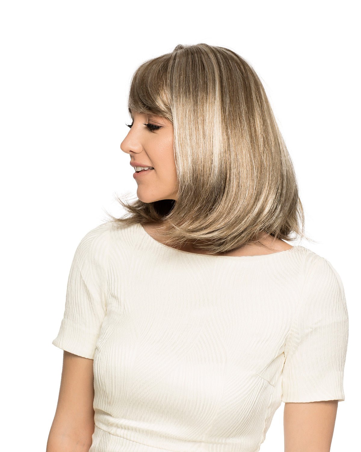 Shoulder length cut with chiseled ends and side-swept textured fringe.