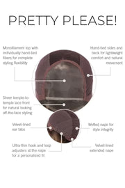 - Cap Construction: Sheer Indulgence™ lace front (temple-to-temple) with monofilament top and 100% hand-tied base