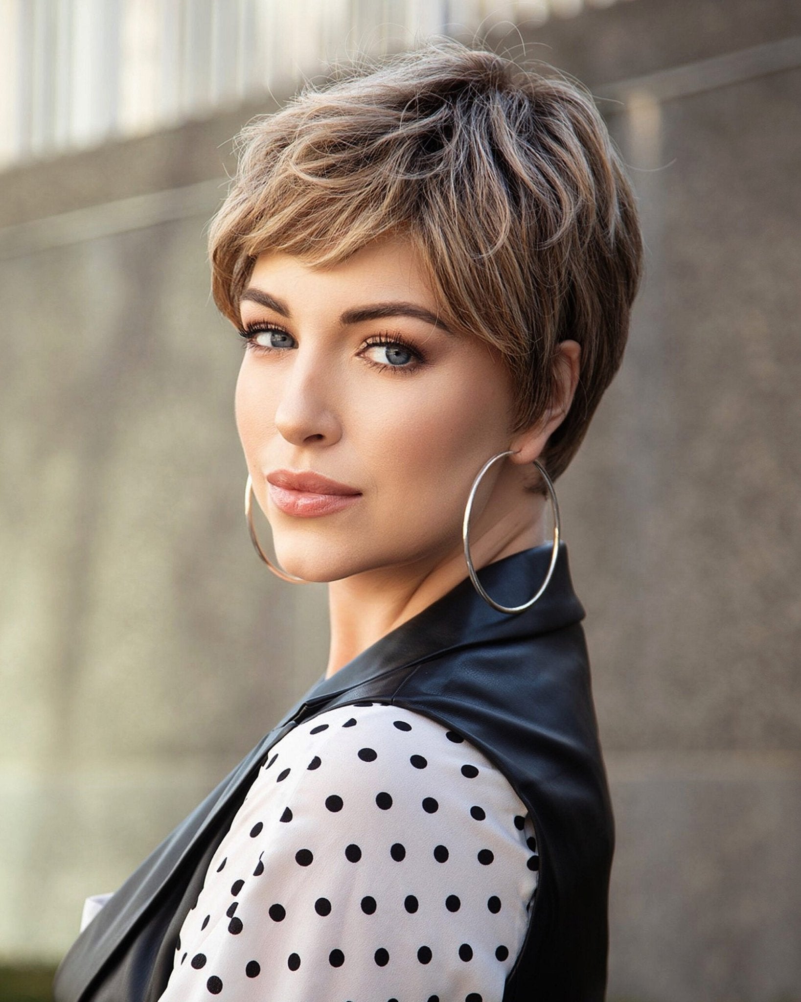 Achieve effortless style in seconds with Out the Door by Gabor, a shake-and-wear pixie designed for busy lifestyles. This short, spirited cut features piece-y texture throughout and a flexible fringe that styles beautifully swept forward for face-framing softness or brushed back for an open, confident look.