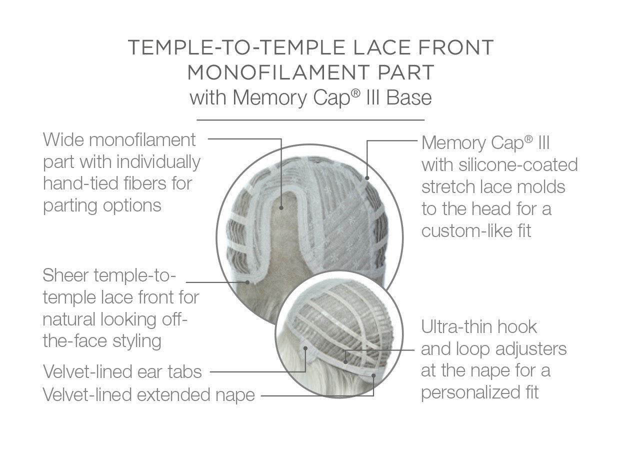 - Cap Construction: Temple-to-temple sheer lace front, monofilament part, Memory Cap® III base, velvet-lined ear tabs, extended nape