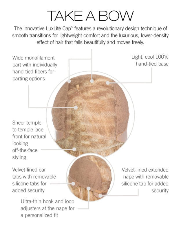 The construction of Take a Bow is nothing short of luxurious. It features the LUXLITE CAP®, a 100% light hand-tied base that provides a light-as-air feel, ensuring you enjoy all-day comfort without a second thought about your hair. A wide, hand-tied monofilament part enhances the wig's natural look, allowing for seamless parting anywhere across the top.