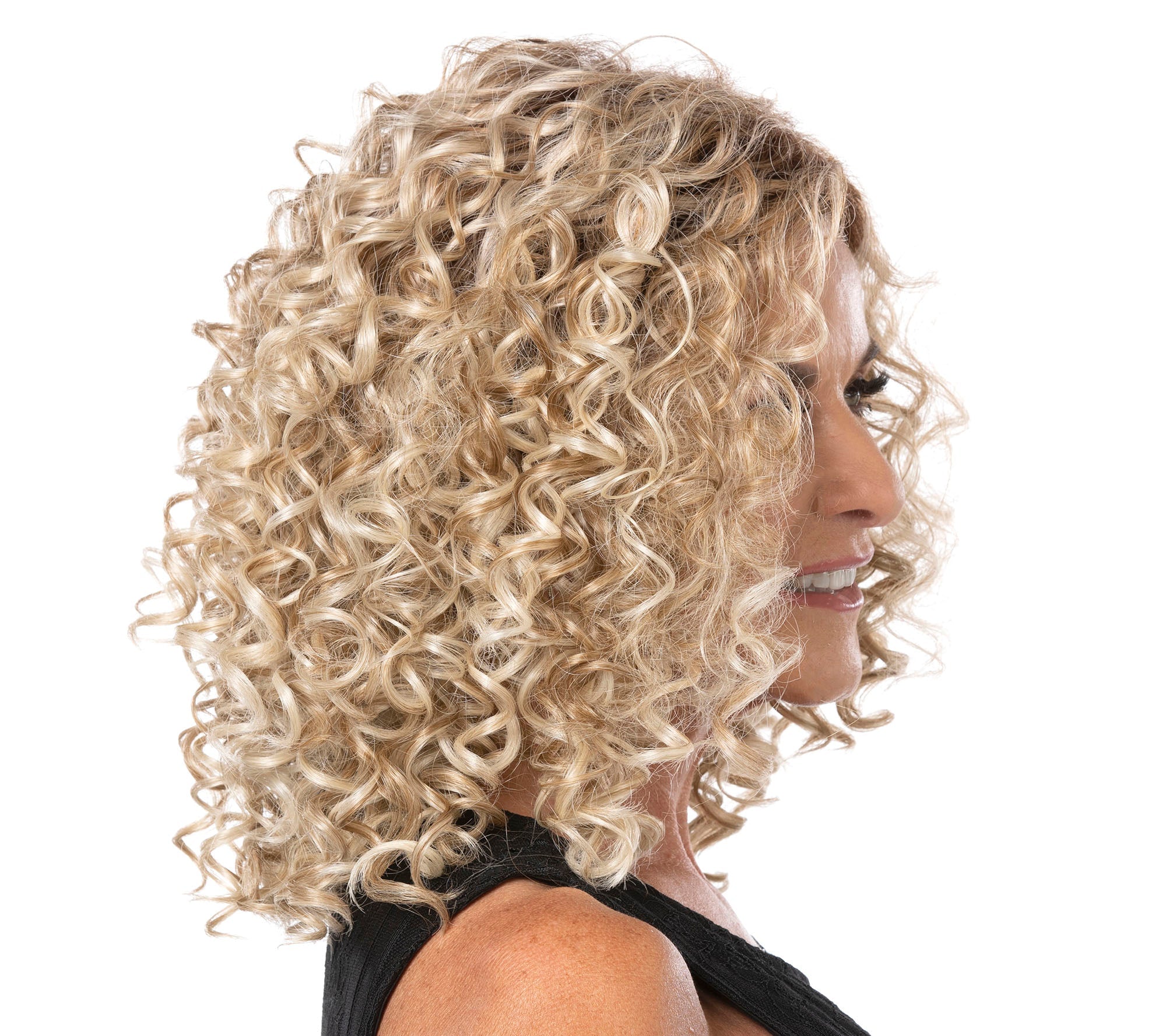 Approximately 9" of Textured Spiral Curl Kanekalon® Synthetic Heat-Friendly Fiber at the Crown, 8 ½" Front, 8 ½" Sides, 8 ½" Back and 7 ½" Neckline for Easy Wear & Easy Care – Just Shampoo Wash and Towel/Air Dry.