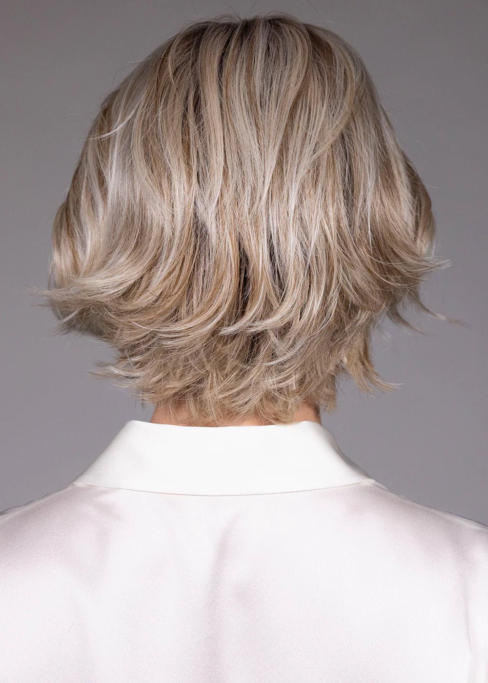 The Butterbeer-R color showcases Belle Tress's signature rooted color technology, featuring warm golden blonde tones with honey highlights and darker roots for natural dimensional beauty. The Butterbeer-R shade combines buttery blonde hues with rich caramel undertones and strategically placed highlights for multidimensional color depth. The dimensional color enhances Marni's short layered structure, creating depth that makes the feathered texture appear more defined and dynamic—perfect for showcasing the playful energy of a modern crop.