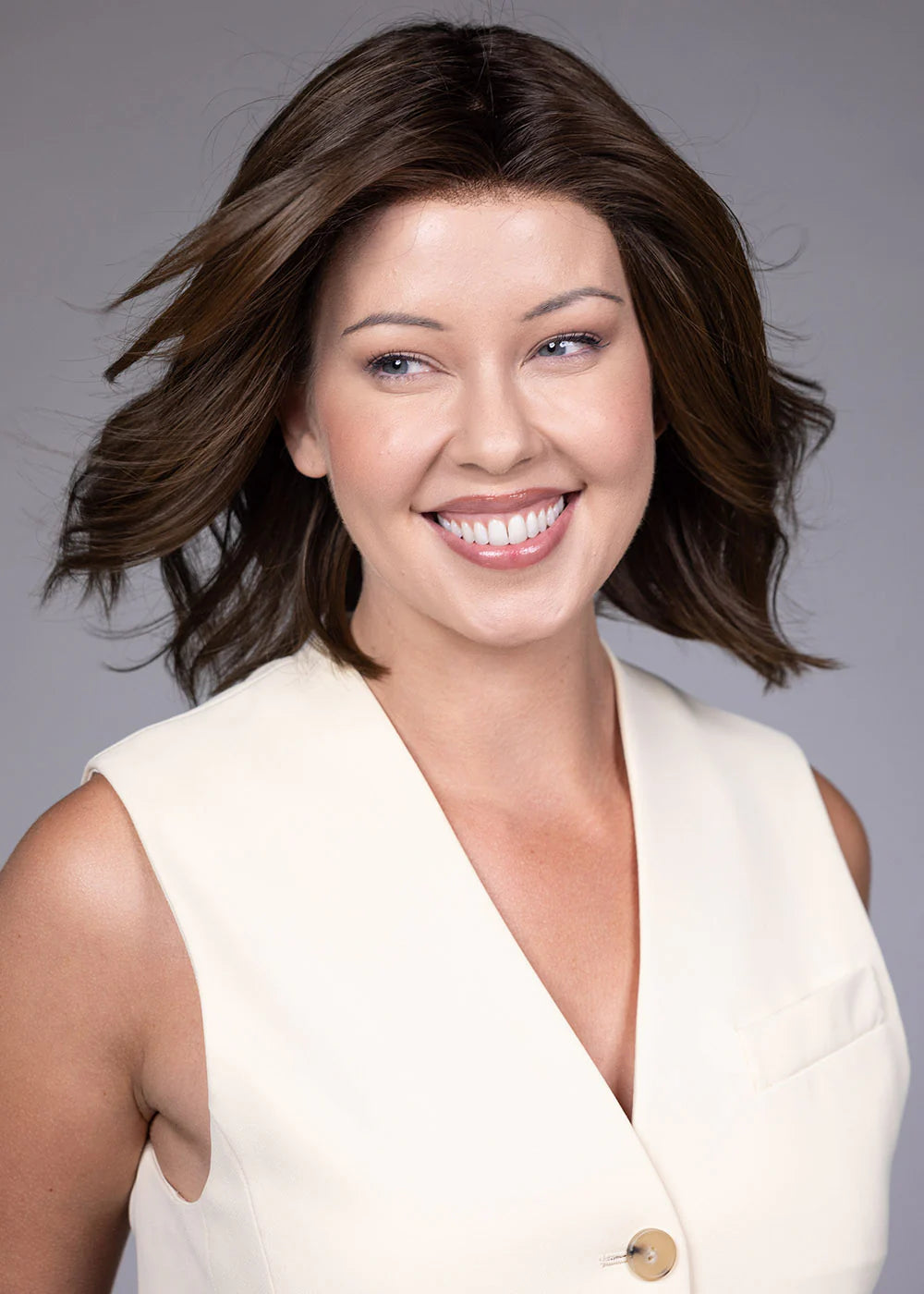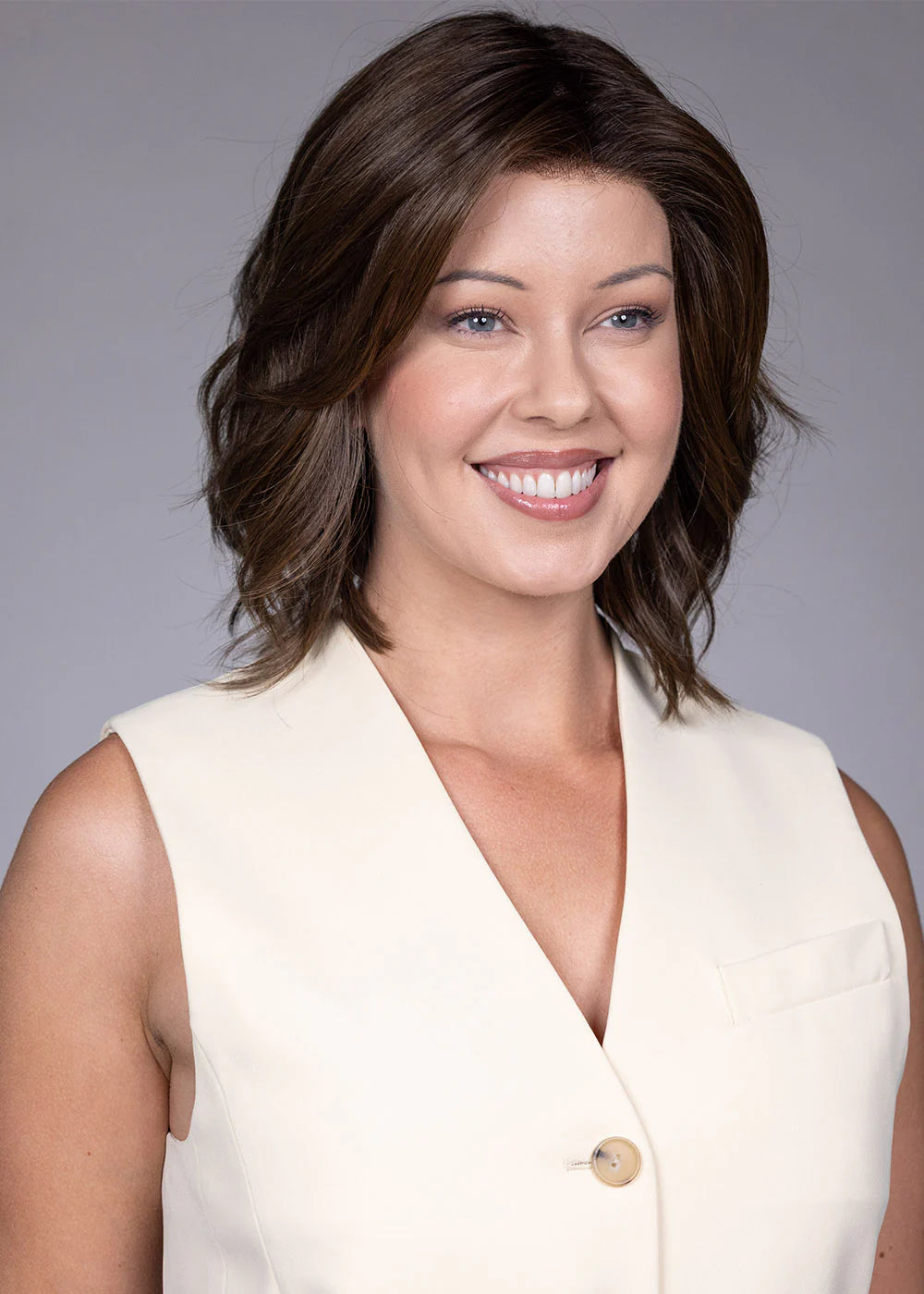 What face shapes does Cyrus flatter? Cyrus's angled bob silhouette with face-framing side bangs flatters a wide range of face shapes, including oval, round, heart, and square. The graduated shape draws the eye forward along the jawline, which can elongate rounder faces while softening more angular features with its clean, structured lines.