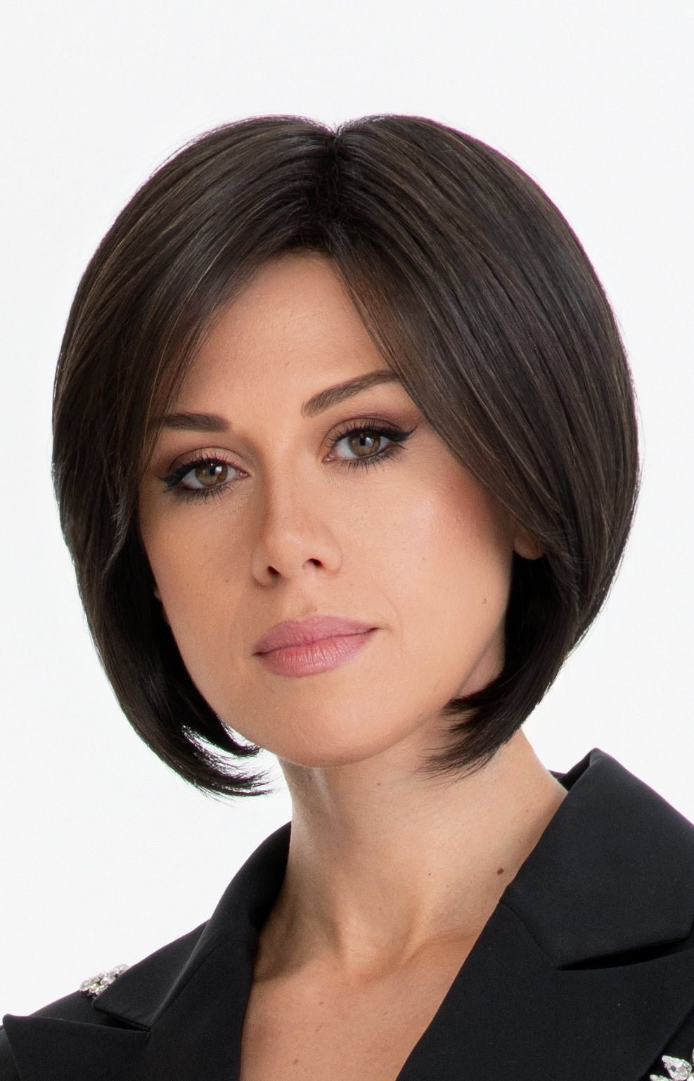 A polished chin-length bob with soft layering and refined side-swept fringe—timeless sophistication that's 40% lighter than traditional synthetic wigs.