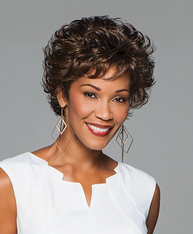 You’ll set a precedent with this short, all-over open curled style that redefines the meaning of no-fuss styling. Just shake and go. The hand-tied top adds cool comfort and the sheer scalloped hairline allows off the face styling.